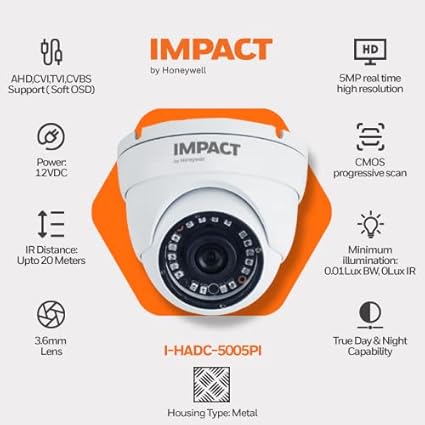 The Impact by Honeywell I-HADC-5005PI is a high-resolution 5MP AHD Dome CCTV Camera designed for indoor security applications. It features a 1/2.7” Progressive Scan Digital Image Sensor, ensuring sharp and accurate video quality with True Day/Night (TDN) capability for seamless transition between lighting conditions. With infrared (IR) night vision, it captures clear footage in complete darkness up to 20 meters. This 4-in-1 camera (AHD, CVI, TVI, CVBS) is compatible with all major DVR brands, making it an ideal choice for home and business surveillance. The durable metal housing with an IP66 rating ensures protection against dust and moisture, while its easy installation makes it suitable even for beginners.