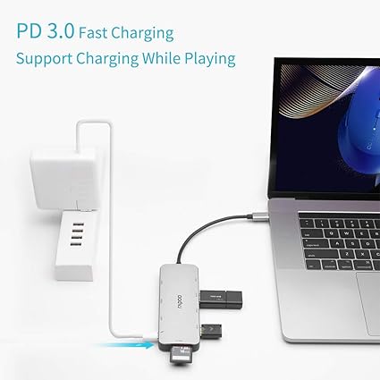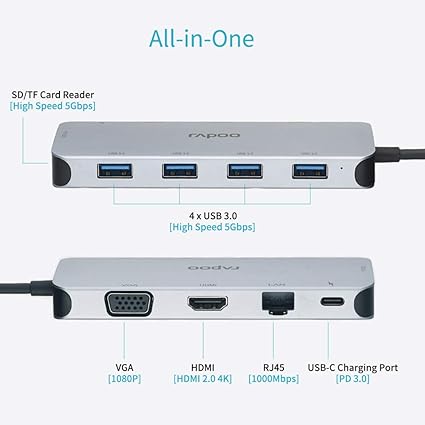 The RAPOO 10-in-1 USB Type-C Hub is a versatile and compact solution designed to enhance connectivity and productivity for modern laptops and smart devices. It features a wide range of ports, including an Ethernet/RJ-45 port, a Type-C PD charging port, four USB 3.0 ports (two of which can be used simultaneously), an HDMI port supporting 4K UHD output, a VGA port, and Micro SD/TF card readers, making it a powerful tool for multitasking. With ultra-fast data transfer speeds of up to 5 Gbps and the ability to extend your screen in 4K resolution, it’s perfect for streaming, presentations, or design projects. Its slim, portable design ensures flexibility for on-the-go use, while its compatibility with devices like MacBook Pro, MacBook Air, and MateBook makes it a reliable choice for daily commuting, traveling, or working in tight spaces. Backed by a 30-day money-back guarantee and 12-month warranty, it offers both quality assurance and excellent customer service.