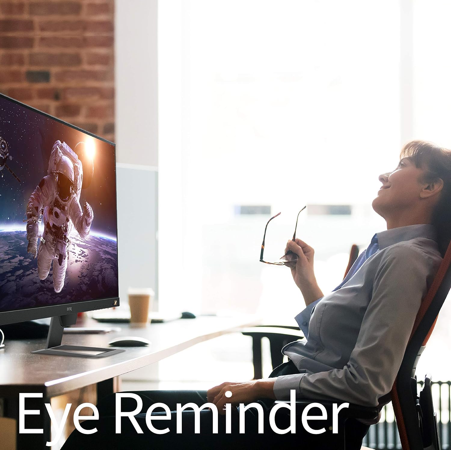 Features Brightness Intelligence, Low Blue Light, Flicker-Free display, and Eye Reminder for reduced eye fatigue during extended use. -