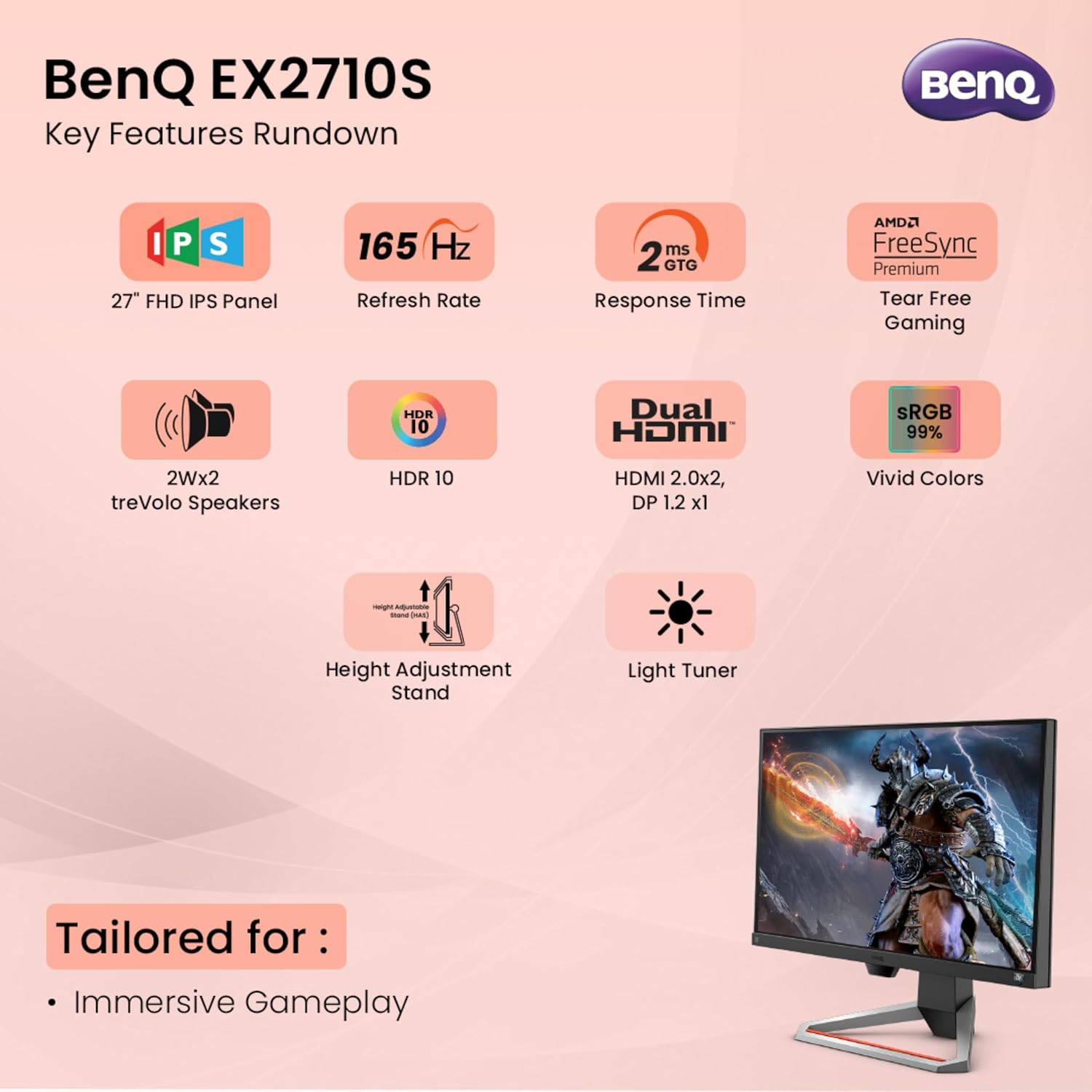 Unlock responsive performance and immersive visuals with the BenQ MOBIUZ EX2710S, a 27-inch Full HD gaming monitor built for fast-paced action. Equipped with a 165Hz refresh rate and 1ms MPRT, it delivers ultra-smooth gameplay with zero motion blur. HDRi optimization and FreeSync Premium ensure vivid color, deep contrast, and screen tear elimination. The built-in treVolo speakers bring premium audio, while ergonomic adjustments and Eye-Care technology support comfort through extended sessions—ideal for both competitive gaming and multimedia use.