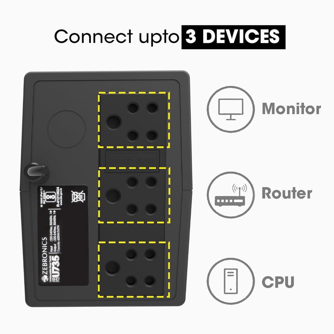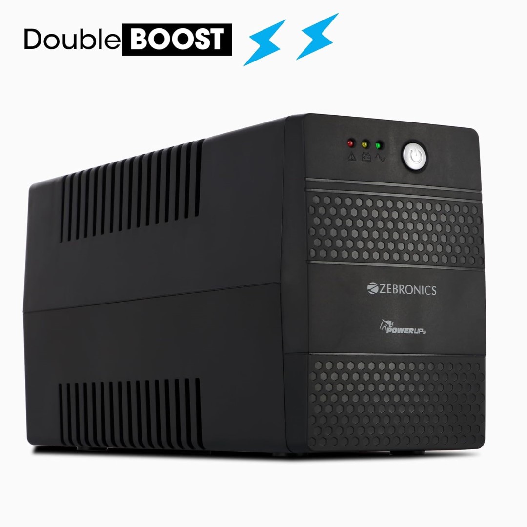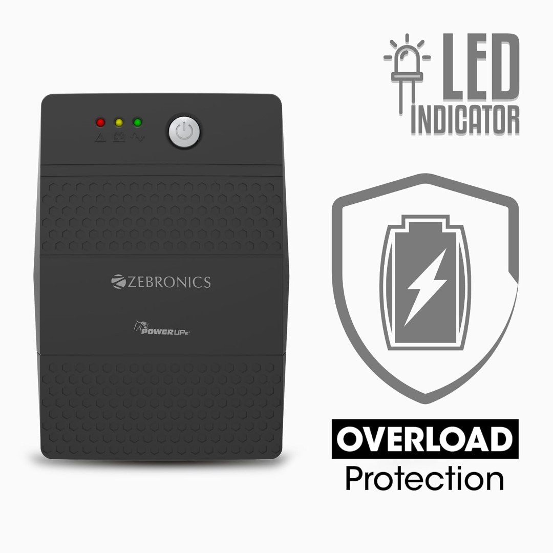 The ZEBRONICS Line Interactive UPS is designed for reliable power management and protection of electronic devices, featuring a robust lead-acid battery cell composition. With a sleek black finish, the UPS operates at 240 volts and is built with a microcontroller-based system that delivers automatic voltage regulation (AVR) for consistent voltage output. It includes features such as auto restart during AC recovery and no-load auto shutdown when in battery mode, ensuring efficiency and safety in operations.